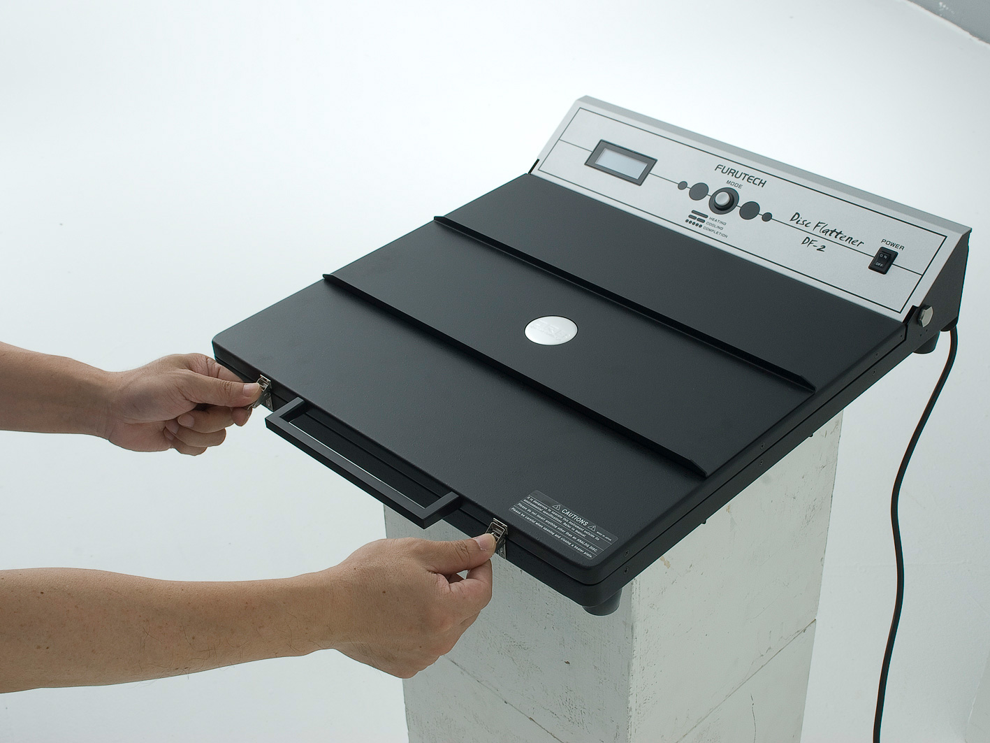 This is the new improved version of the Furutech LP flattener that is now approved for FLAT-PROFILE/NO GROOVE-GUARD discs. Ultimate Performance & Ultimate Refinement with Ultimate Luxury Every vinyl enthusiast has records in their collection, or come across LPs they'd love to own, but were just too warped for any cartridge/arm to track. The DF-2 the one-stop, one-button solution to your problems! The DF-2 provides controlled-heat perfect flattening for all your warped records, even those with only slight irregularities just enough to unsettle your cartridge and cause mis-tracking. Warps are bad news no matter how you look at it. If the arm/cartridge remains parallel to the LP's surface as with a flat record, VTA (Vertical Tracking Angle) remains unchanged throughout every rotation. Additionally, as the arm/cartridge tracks a warp on its upside, it places greater pressure on the stylus which changes VTF (Vertical Tracking Force) until the peak of the warp, whereupon the cartridge becomes unloaded with too little VTF on the way down. Of course, all this muddles the sound, changing the tonal quality, imaging and soundstage characteristics of the cartridge. A flat record also tracks better with less distortion. An LCD display on the unit keeps you informed of progress, with a tone sounding when done. IMPORTANT: The following LPs should not be treated in the DF-2: 1) LPs weighing less than 110g 2) Light LPs that were manufactured between 1973-74 (Oil crisis) weights range from 100g to 115g.